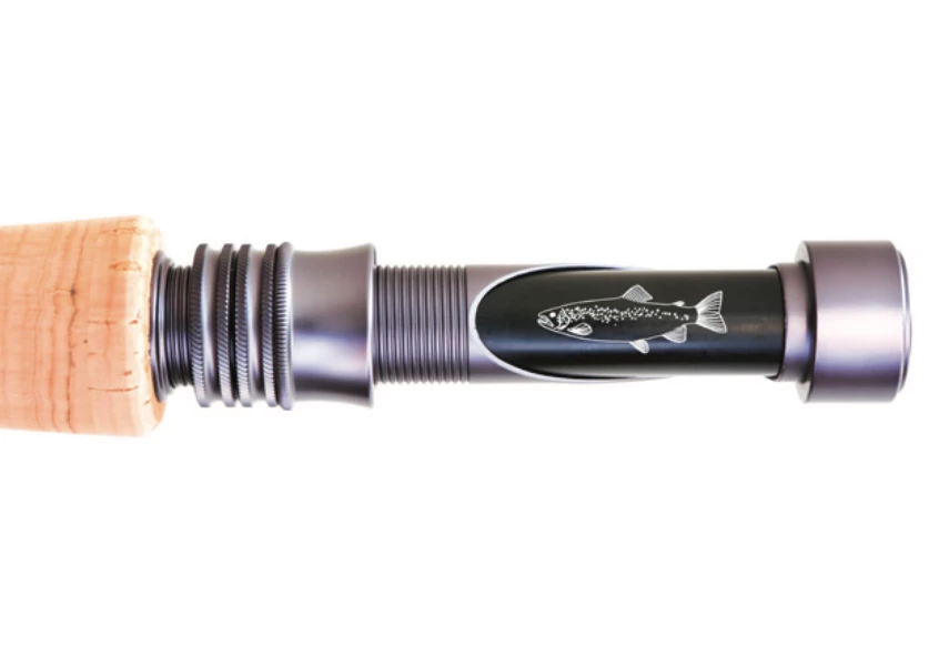 Reel seat: Screw-down style seat on longer rods – to improve balance at the wrist so minimizing fatigue). Made of 5040 anodized aluminum. The spacer has been laser engraved with a trout