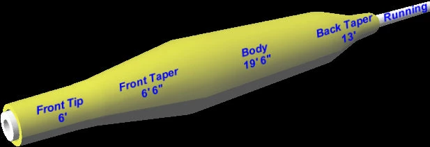 6′ Front Tip, 6’6″ Front Taper, 19’6″ Body, and 13′ Back Taper. This creates a line that easily loads a rod at short ranges, but still able to shoot line and cast long range. These lines are very supple and have very little memory..