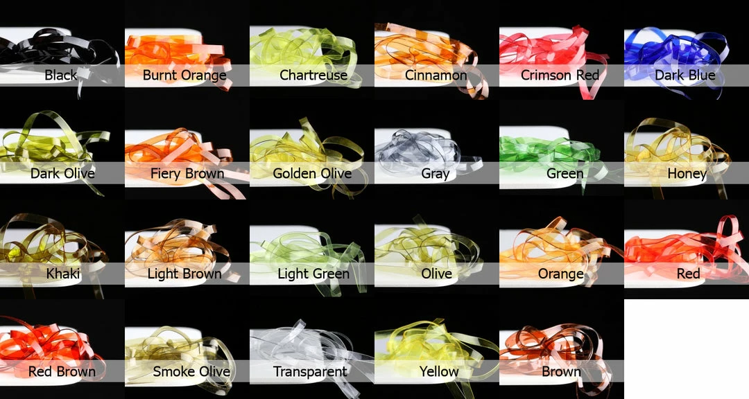 | Color | Black Peacock, Brown, Burnt Orange, Chartreuse, Cinnamon, Crimson Red, Dark Blue, Dark Olive, Fiery Brown, Golden Olive, Gray, Green, Honey, Khaki, Light Brown, Light Green, Olive, Orange, Red, Red Brown, Smoke Olive, Transparent, Yellow |