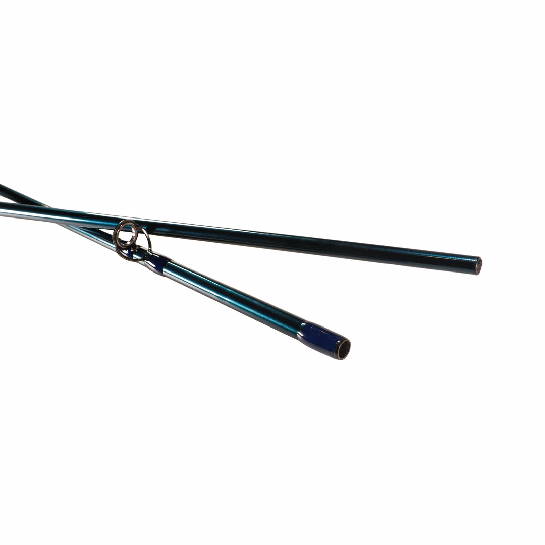 This four piece rod has a dark blue finish with blue hued features and silver guides. Features and uplocking reel seat and blue canvas rod tube that comes with an attached reel pouch.