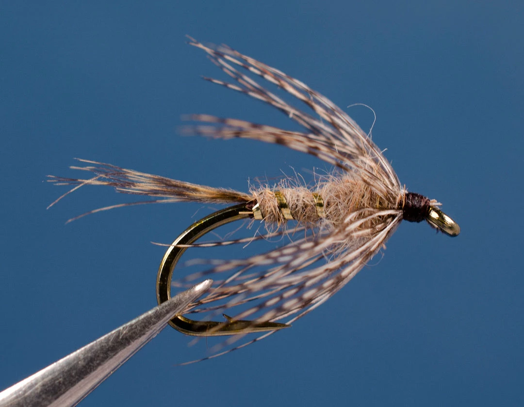 Tied with hare’s ear blended with fox fur. With wood duck flank feathers.