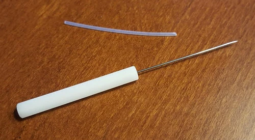 A 1/4 hexagonal nylon handle over a high quality needle provides pin point placement of a drop of cement. This tool is also very effective when used to tie nailknots.