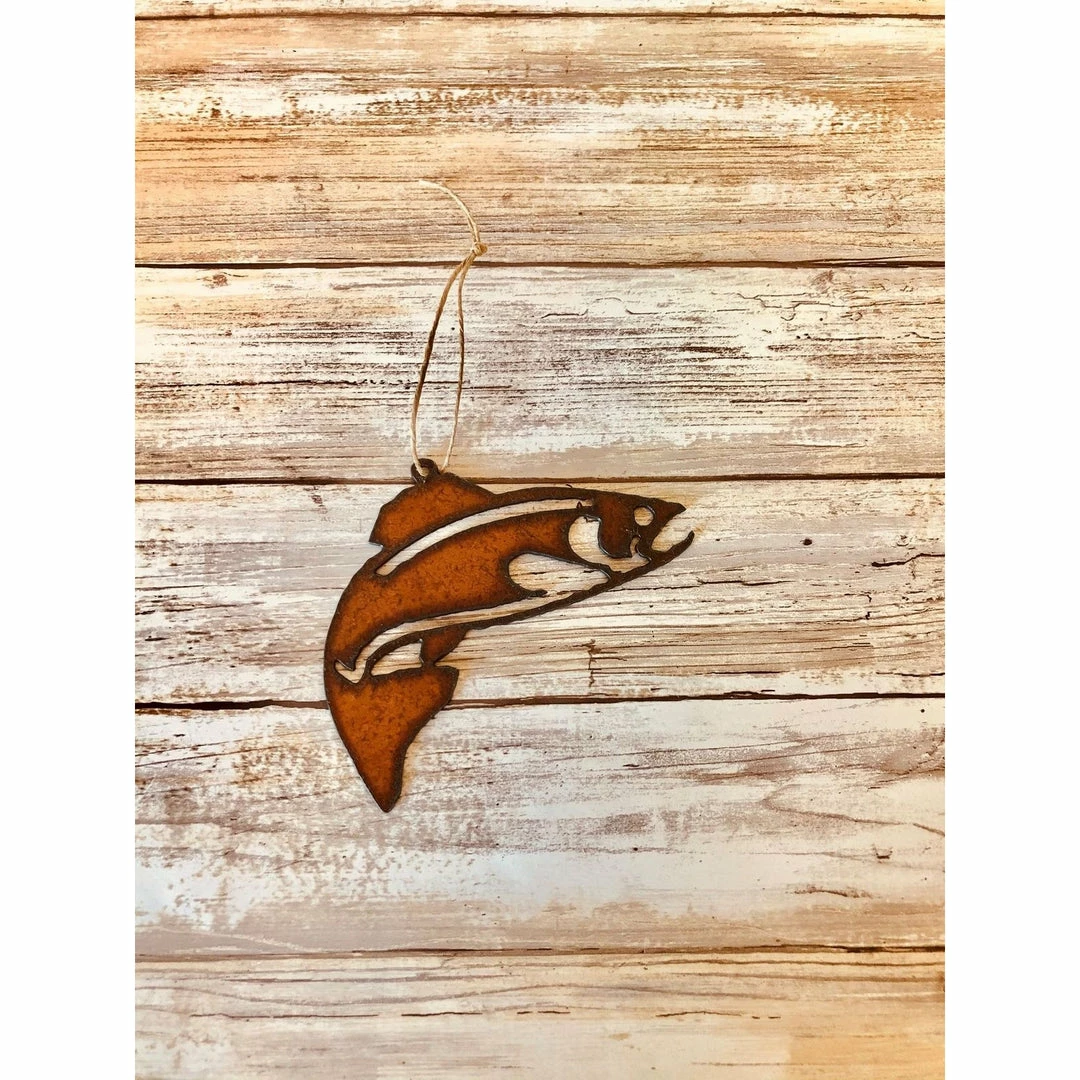 Trout ornament. 4.75 W x 3.5 H This Ornament is made with 18 Gauge Steel. Do to the Natural Rusting Process color may vary slightly, Made In Prescott Arizona