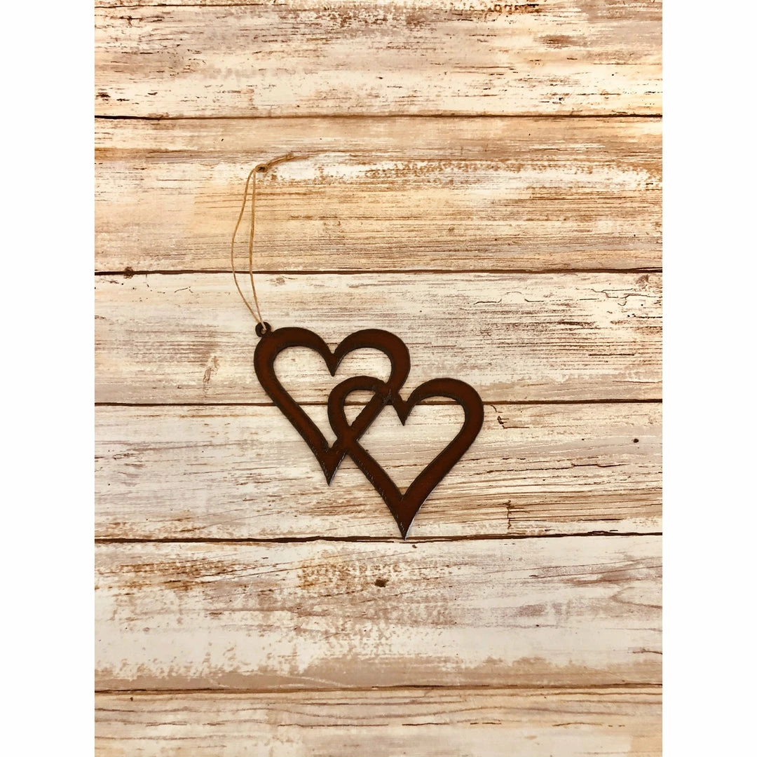 Double heart ornament. This Ornament is made with 18 Gauge Steel. Due to the Natural Rusting Process color may vary slightly, Made In Prescott Arizona