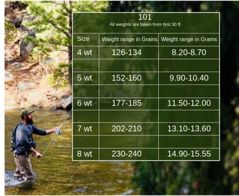 All 101 lines are a half size above the AFFTA standards. You can see the weight ranges in the chart pictured here (weights are measured from the first 30 ft of the head). All of our lines manufactured here at Monic are constructed at or just above the AFFTA standards.