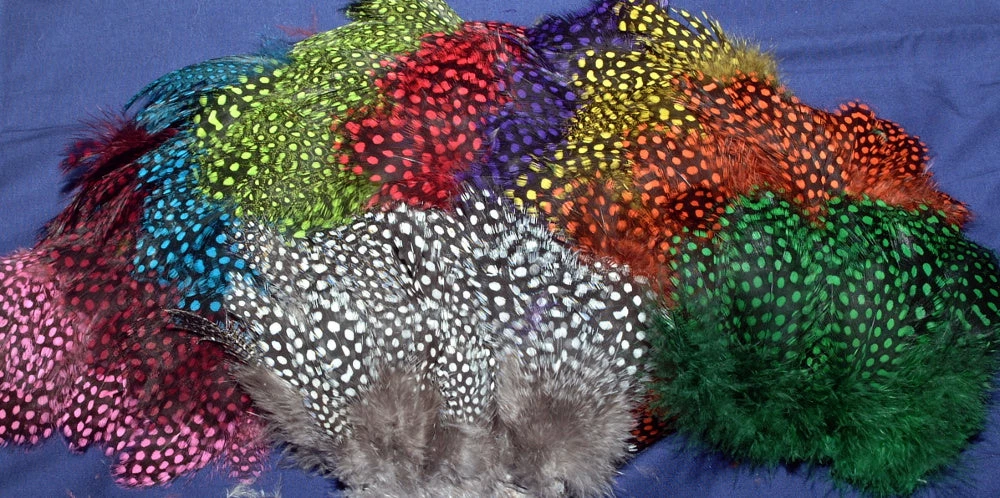 The grizzly hackle of the non chicken birds. Guinea Fowl has so many uses for it and so many are over looked. It is great for breaking up color on large soft hackles, bass bugs and saltwater flies. It is a standard in many salmon patterns and streamer on both throats and cheeks. It even used a lot for wings on large wets (M.O.M. Flies).