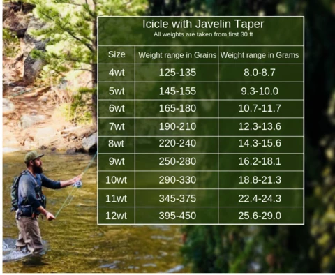All Icicle Javelin Taper lines are a half size above the AFFTA standards. You can see the weight ranges in the chart pictured below (weights are measured from the first 30 ft of the head). All of our lines manufactured here at Monic are constructed at or just above the AFFTA standards.