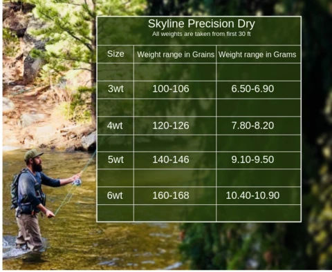 All Precision Dry Skylines are weighted at the AFFTA standards. You can see the weight ranges in the chart pictured here (weights are measured from the first 30 ft of the head).