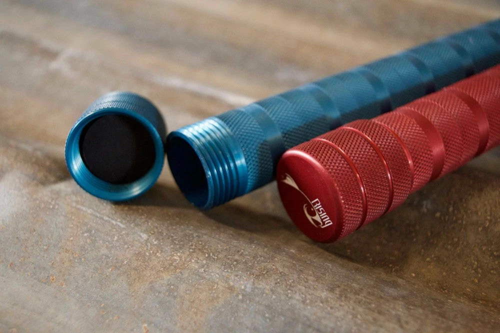 - Threaded sealed end-cap makes for water-proof storage in the handle – Streamside flask