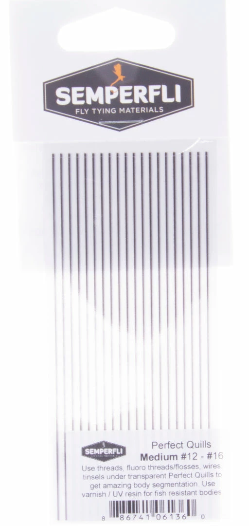 Amazing synthetic quills, clear and tapered these form the most amazing bodies on flies, from nymphs, shrimps, wets and dry flies. Totally synthetic Perfect Quills are made from a thin tapered vinyl from a point to 3mm width with a wonderful black edging strip to form the rib. Use any coloured materials from threads to tinsels or even permanent marker pens then the colour will shine through. To make an indestructable fly use a UV resin or varnish over the top to stop fish teeth damaging your fly bodies.