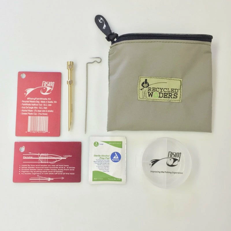 After we built our first prototype brass tools, we knew we’d be making a Fish Whistle and that we needed a sweet Kit to hold all the essential ingredients. Our first thought was Recycled Waders for the bag since we liked the concept of their company, and thought up-cycling waders into a pouch to hold your Fish Whistle gear would be awesome. Fortunately, they are located in Oregon and got what we were trying to accomplish.. The entire bag besides the large zipper, and our tough pull tab is made from up-cycled wader material. It looks cool, feels good, and keeps everything organized.