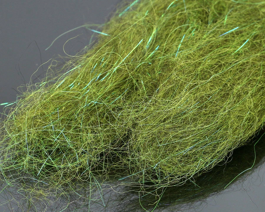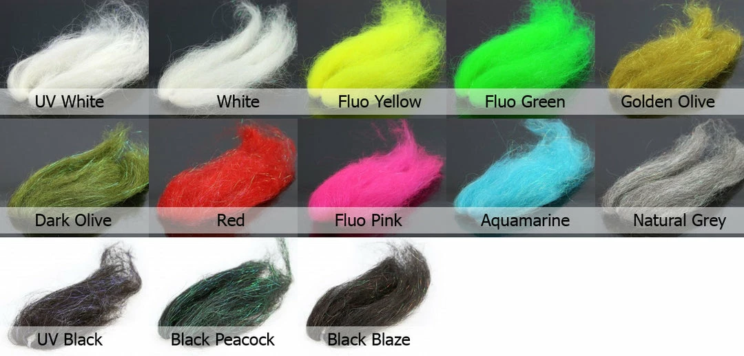 A unique mixture of Icelandic sheep coat (without undercoat) and fine fibers with a pearlescent sheen. Very great for pike/musky and saltwater flies, is perfect for long tube patterns. This material maintains its translucence when wet and provides a lot of movement.