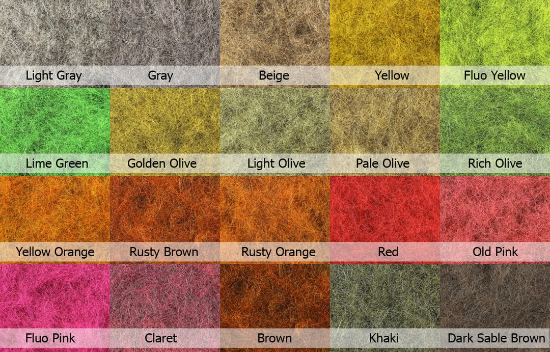 | Color | Beige, Brown, Claret, Dark Sable Brown, Fluo Pink, Fluo Yellow, Golden Olive, Gray, Khaki, Light Gray, Light Olive, Lime Green, Old Pink, Pale Olive, Red, Rich Olive, Rusty Brown, Rusty Orange, Yellow Orange, Yellow |