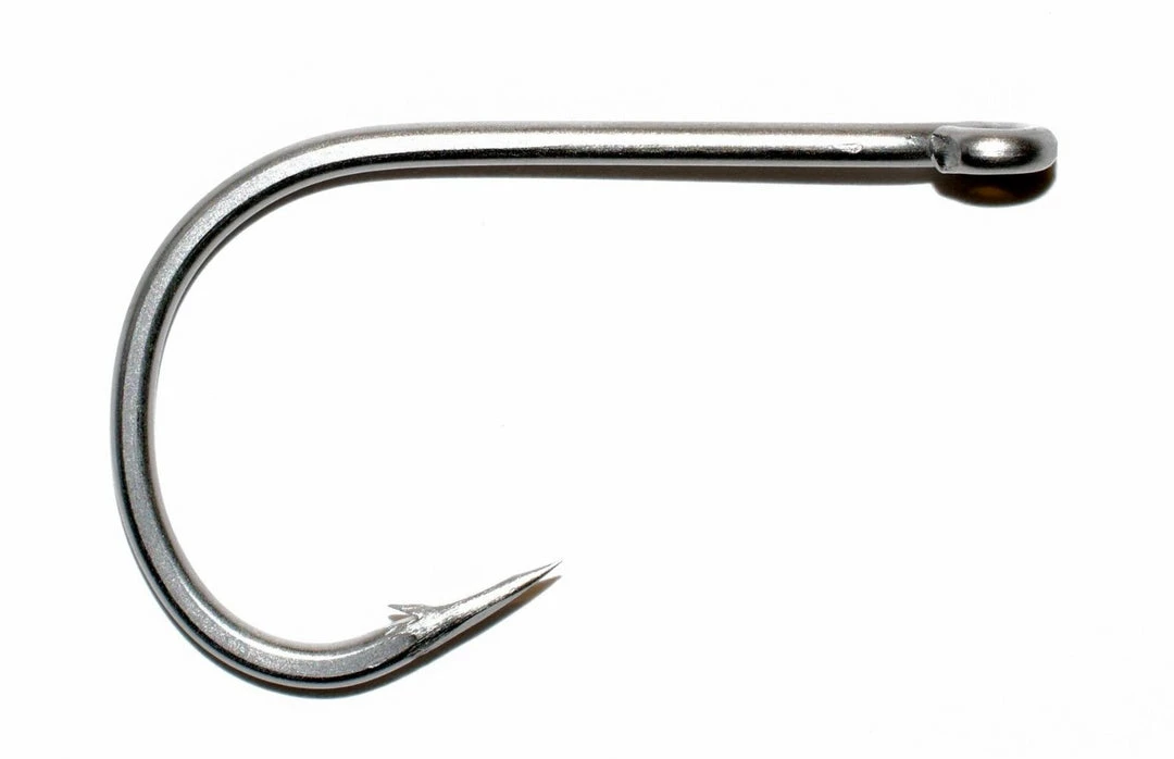 Heavy Stainless wire, wide gape, extra-sharp V-CUT point, straight eye. 12 hooks per pack