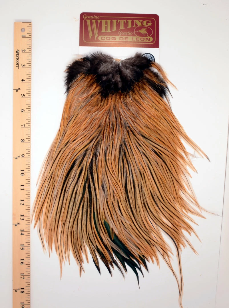 Coq de Leon rooster are large birds with glossy feathers and long barbs. Most commonly used for tailing the saddles feature stiff long barbs. They are also suitable for large hackle collars are there is even a growing trend using them for wings on predator flies in place of the flat-wing saddles.